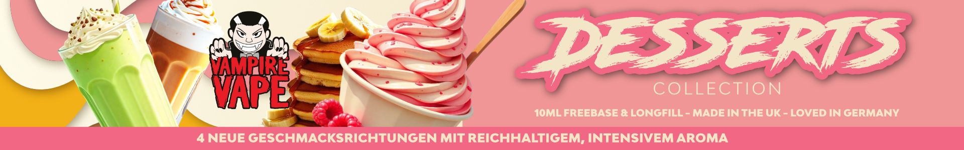 Vampire Vape Desserts Longfill Aromen richten sich an alle Dampfer, die süße, cremige und vollmundige Geschmacksrichtungen bevorzugen und ihr E-Liquid selbst mischen möchten. Die Dessert-Serie von Vampire Vape ist bekannt für ihre intensiven, ausgewogenen Aromen, die an klassische Nachspeisen erinnern – von cremigen Desserts über feine Süße bis hin zu komplexen, runden Geschmackskompositionen.