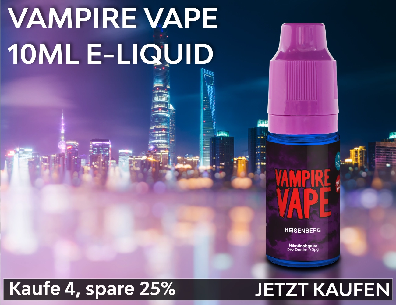 Unsere Marke „Vampire Vape“ und der Vape Shop wurden 2012 in England gegründet. Wir starteten mit einer kleinen Auswahl an Vape E-Liquids, die wir zum Kauf anboten. Nach und nach steigerten wir unsere Range und fanden mit unserem Vape Shop immer mehr Aufmerksamkeit. Allen voran die erfrischenden, neuen Liquids in höchster Qualität, von denen wir heute mehr als 50 in unserem Dampfer Online-Shop führen und die ausgesuchten Premium-Marken fanden großen Anklang, der uns heute zu einem der führenden Vape Shops macht.